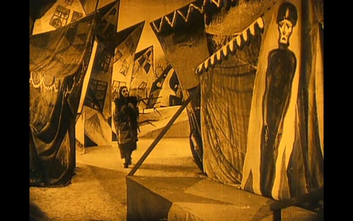 Los decorados se caracterizan por ser distorsionados, irreales, opuestos a toda intención naturalista, con telas pintadas recreando falsas perspectivas y una profundidad de campo irreal. Se juega con las líneas rectas, las diagonales, huyen en todo momento de la curva, los ángulos son puntiagudos y es una arquitectura por completo asimétrica: las paredes están inclinadas, las ventanas son deformes y los caminos son curvos y retorcidos. Se consigue crear una sensación constante de angustia, amenaza y opresión que potencia lo que ocurre en la trama argumental.