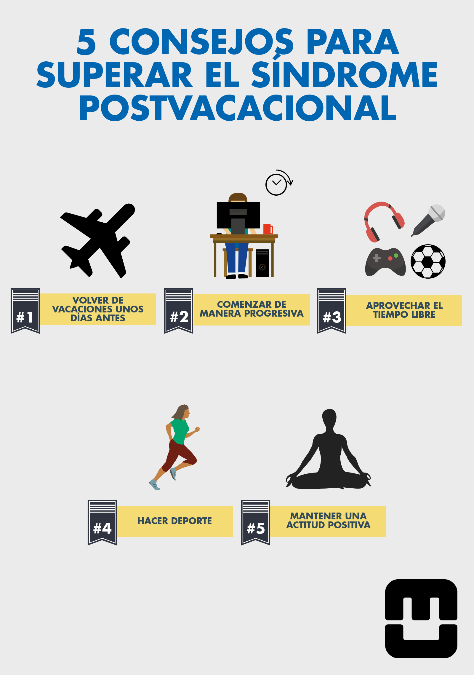Es bueno contar con unos días entre el final del periodo de vacaciones y la vuelta al trabajo. Esta medida te ayudará a aclimatarte de forma más paulatina a tu vida laboral y a la rutina de cada día (se adaptan mejor los horarios de descanso, trabajo, comidas y ocio y no se produce un cambio tan brusco). Asimismo, la coincidencia de que el primer día de vuelta al trabajo coincida en lunes puede agravar la situación. Lo mejor, en la medida de lo posible, es volver un día diferente de la semana para reducir el impacto psicológico.